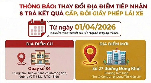 Từ ngày 01 tháng 4 năm 2026, Bộ phận tiếp nhận và trả kết quả giải quyết thủ tục hành chính trong lĩnh vực cấp, đổi Giấy phép lái xe (hình thức trực tiếp hoặc qua dịch vụ bưu chính) thuộc Phòng Cảnh sát giao thông Công an tỉnh Đồng Nai sẽ chuyển địa điểm làm việc.